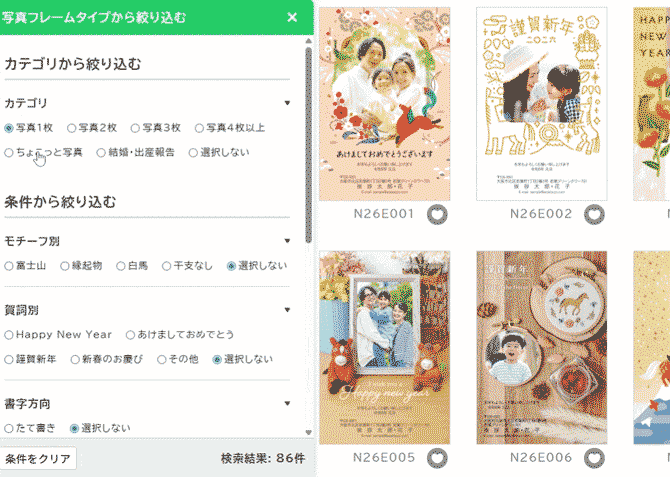 お好みの検索条件を選択することで、挨拶状ドットコム全商品の中からより簡単に・手軽にお好みの年賀状デザインを見つけることが可能になりました。